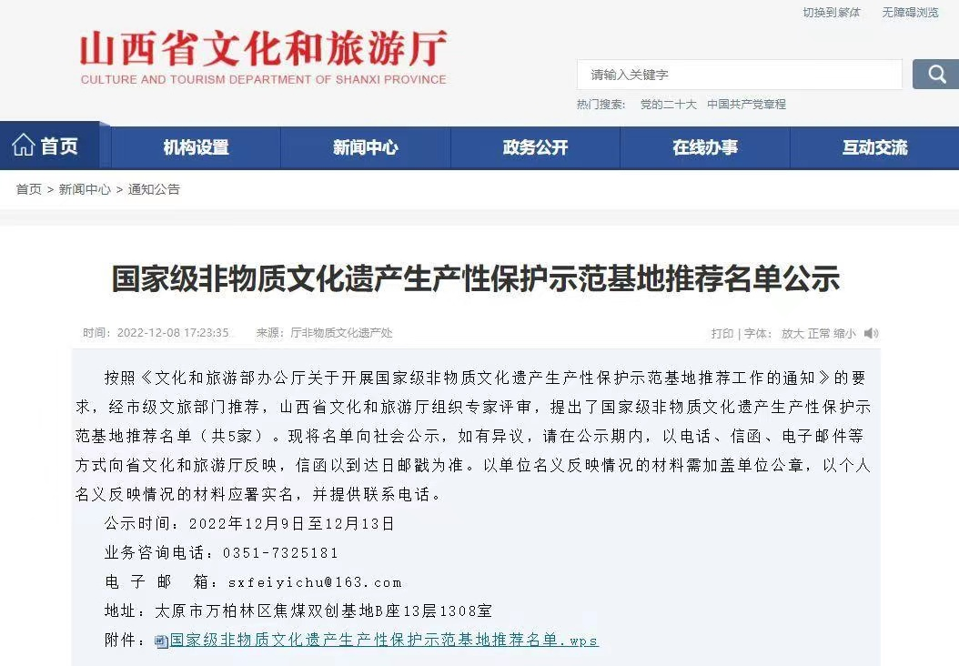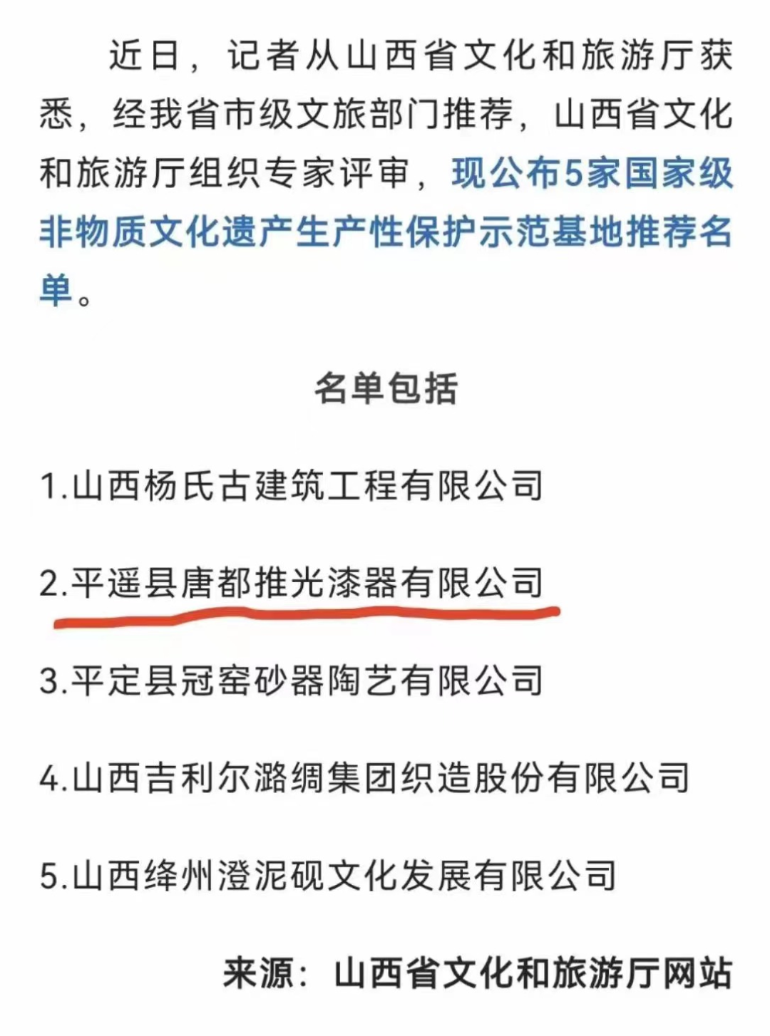 近日,根據(jù)《文化和旅游部辦公廳關(guān)于開展國(guó)家級(jí)非物質(zhì)文化遺產(chǎn)生產(chǎn)性保護(hù)示范基地推薦工作的通知》,經(jīng)市文旅部門推薦,山西省文化和旅游廳組織專家評(píng)審,平遙唐都推光漆器有限公司入選“國(guó)家級(jí)非物質(zhì)文化遺產(chǎn)生產(chǎn)性保護(hù)示范基地”推薦名單。