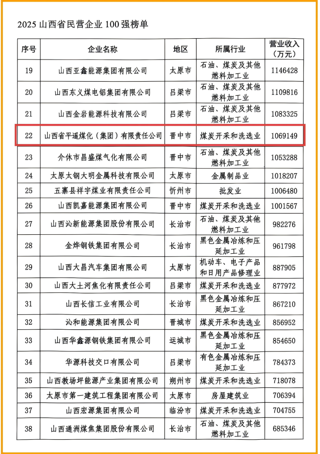 9月18日,山西省工商聯(lián)發(fā)布“2025山西省民營(yíng)企業(yè)100強(qiáng)”榜單,平遙煤化集團(tuán)憑借雄厚的經(jīng)濟(jì)實(shí)力與強(qiáng)勁的發(fā)展勢(shì)頭再度登榜,位列第22位。